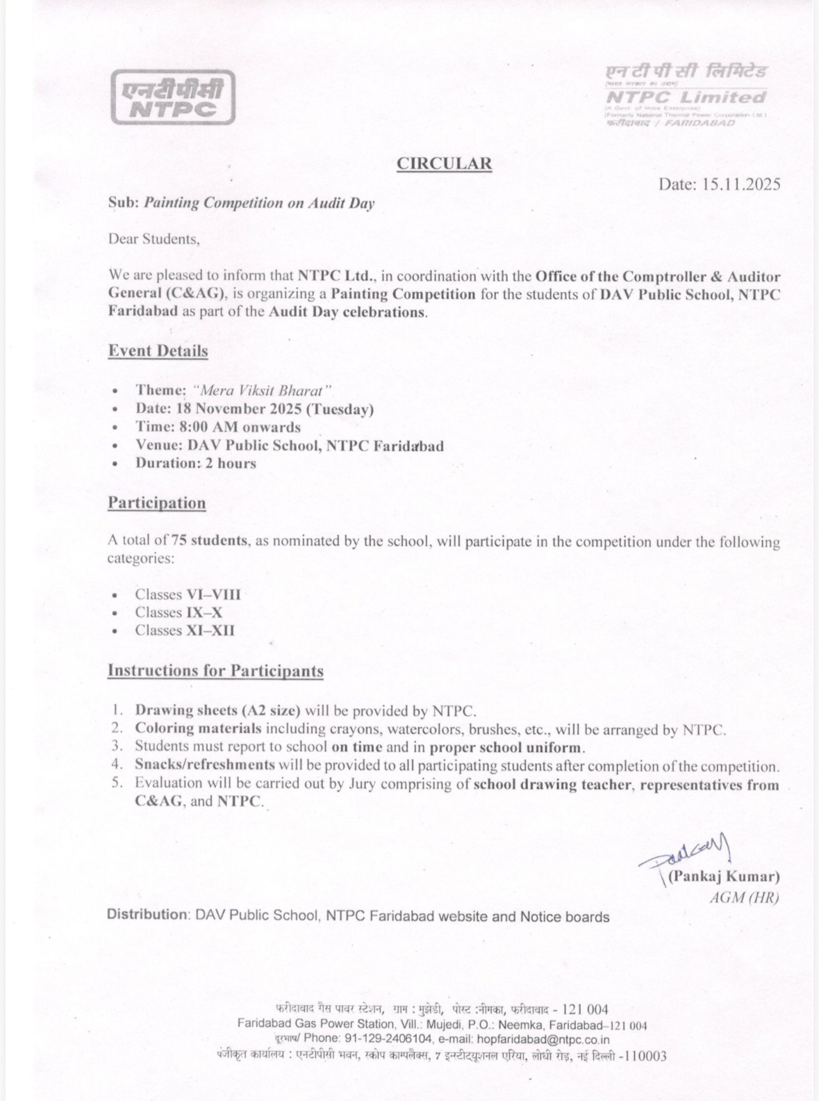 DAV PUBLIC SCHOOL NTPC NTPC Campus, Sector-70, Rashmipuram, Faridabad Phone : 8447300350 E-Mail : [email protected] Website : www.davntpcfbd.in